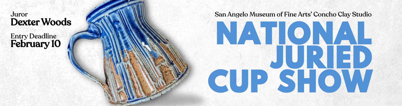 The Concho Clay Studio National Juried Cup Show invites ceramic artists 18 and older from across the United States to submit functional and sculptural cup works for exhibition in Gallery Verde during San Angelo’s 2026 Ceramics Weekend. Juried by Dexter Woods, this national competition offers cash awards including Juror’s Choice and People’s Choice, as well as the opportunity for museum purchase.