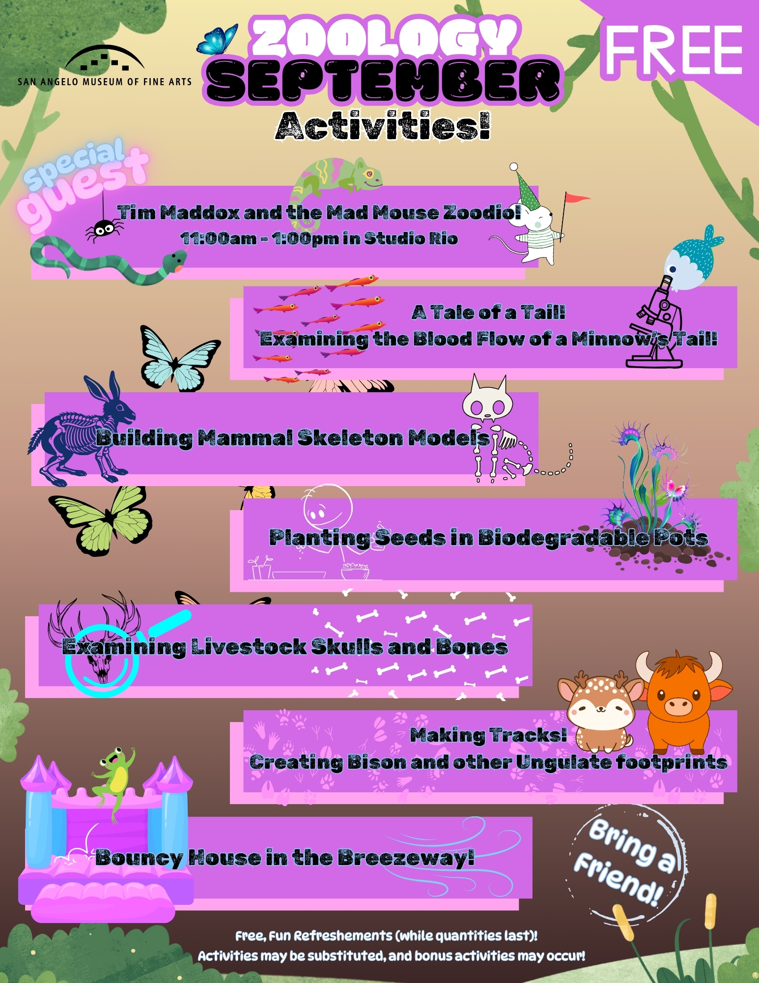The San Angelo Museum of Fine Arts Family Day program is hosted monthly and free of charge to community members. Family Day provides a participatory exploration of global cultures and themes based on SAMFA’s collections. This cultural and thematic exploration is achieved by utilizing the entire museum facilities to provide extensive displays of artifacts, a variety of food samples (including visitor participation in cooking), live music and/or cultural performances, and four or more visual art hands-on projects. In addition, there is no admission fee to the Museum’s current exhibits during Family Day.