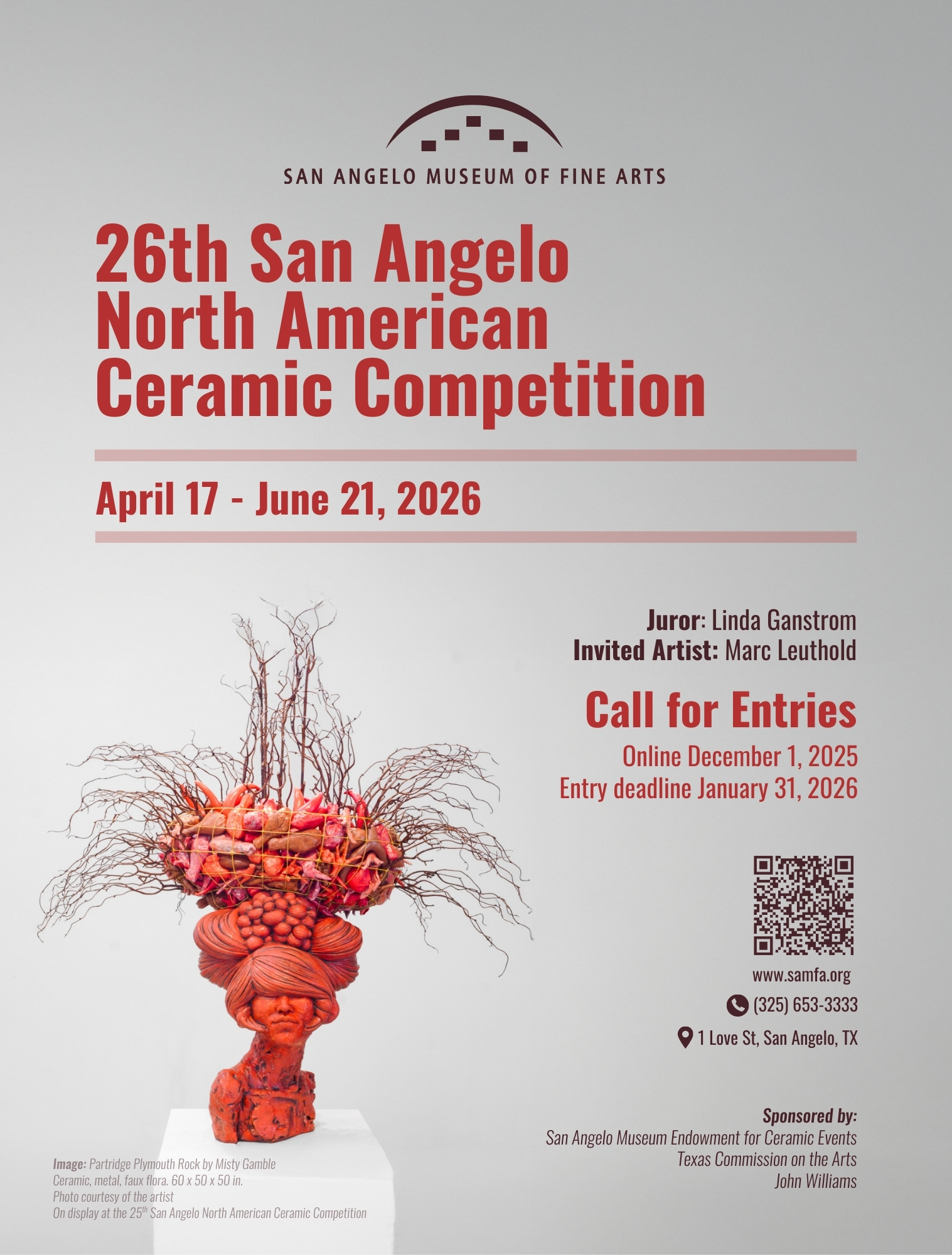 The San Angelo North American Ceramic Competition, hosted every two years, is open to artists residing in the United States, Canada, and Mexico. Clay or ceramic artworks, both functional and sculptural, are eligible for submission. Submissions must have been completed within the last two years.