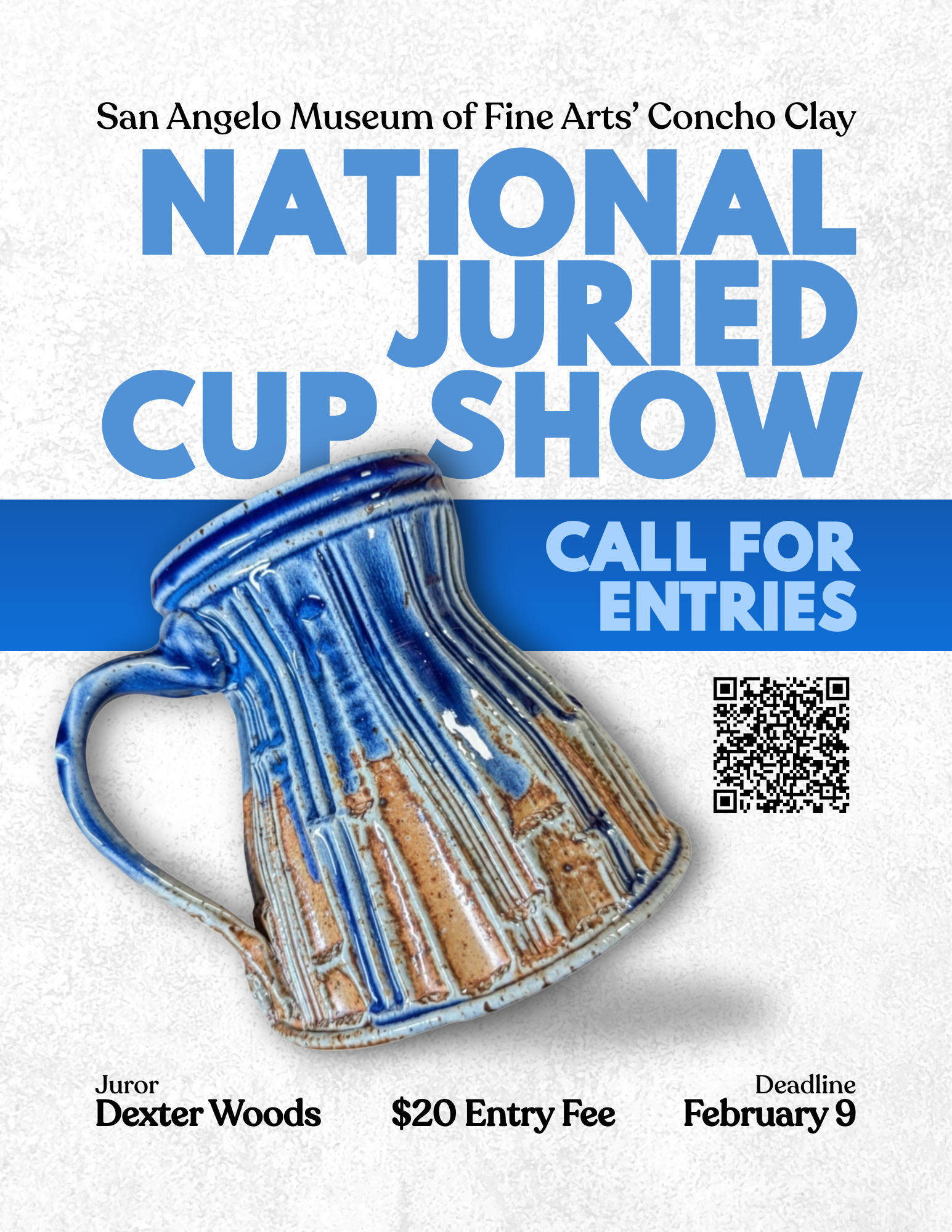 The Concho Clay Studio National Juried Cup Show invites ceramic artists 18 and older from across the United States to submit functional and sculptural cup works for exhibition in Gallery Verde during San Angelo’s 2026 Ceramics Weekend. Juried by Dexter Woods, this national competition offers cash awards including Juror’s Choice and People’s Choice, as well as the opportunity for museum purchase.