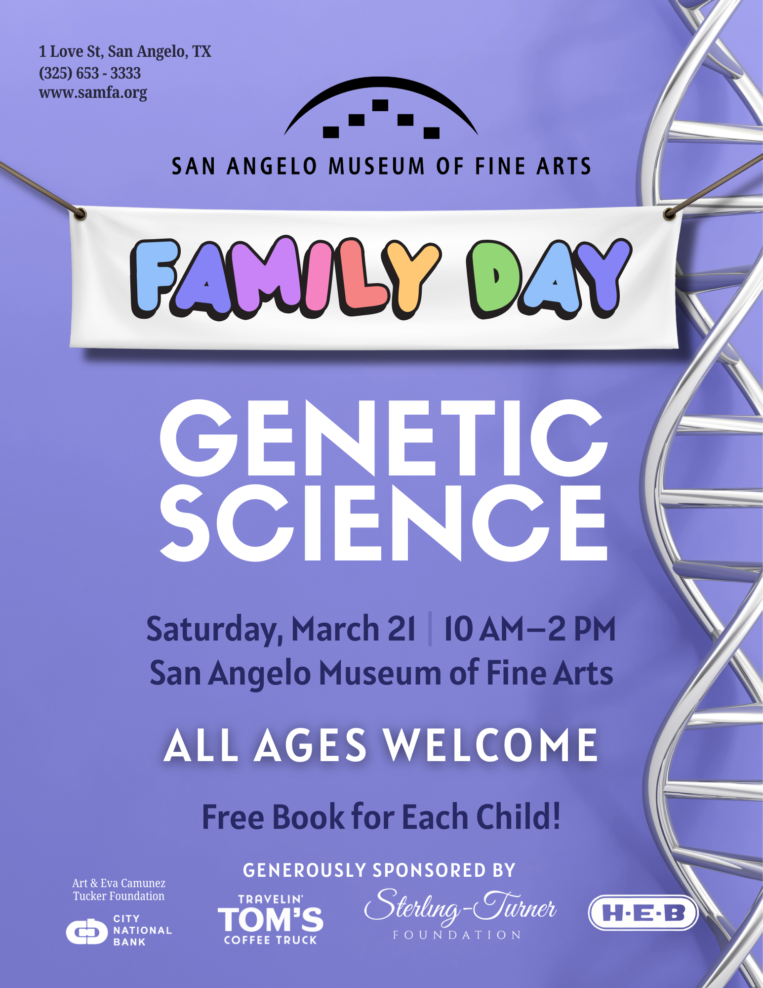 STEAM at SAMFA presents Genetic Science themed March featuring educational art and science experiences for all ages. Bring your friends and family for a day of hands-on STEAM activities such as a Build-A-Beast monster genetics project, DNA model building, "the Art of Me" project, and 3D model building. Be sure to visit the Concho Clay Studio! Kids can enjoy open, drop-in clay activities for the duration of Family Day. No sign-ups required!